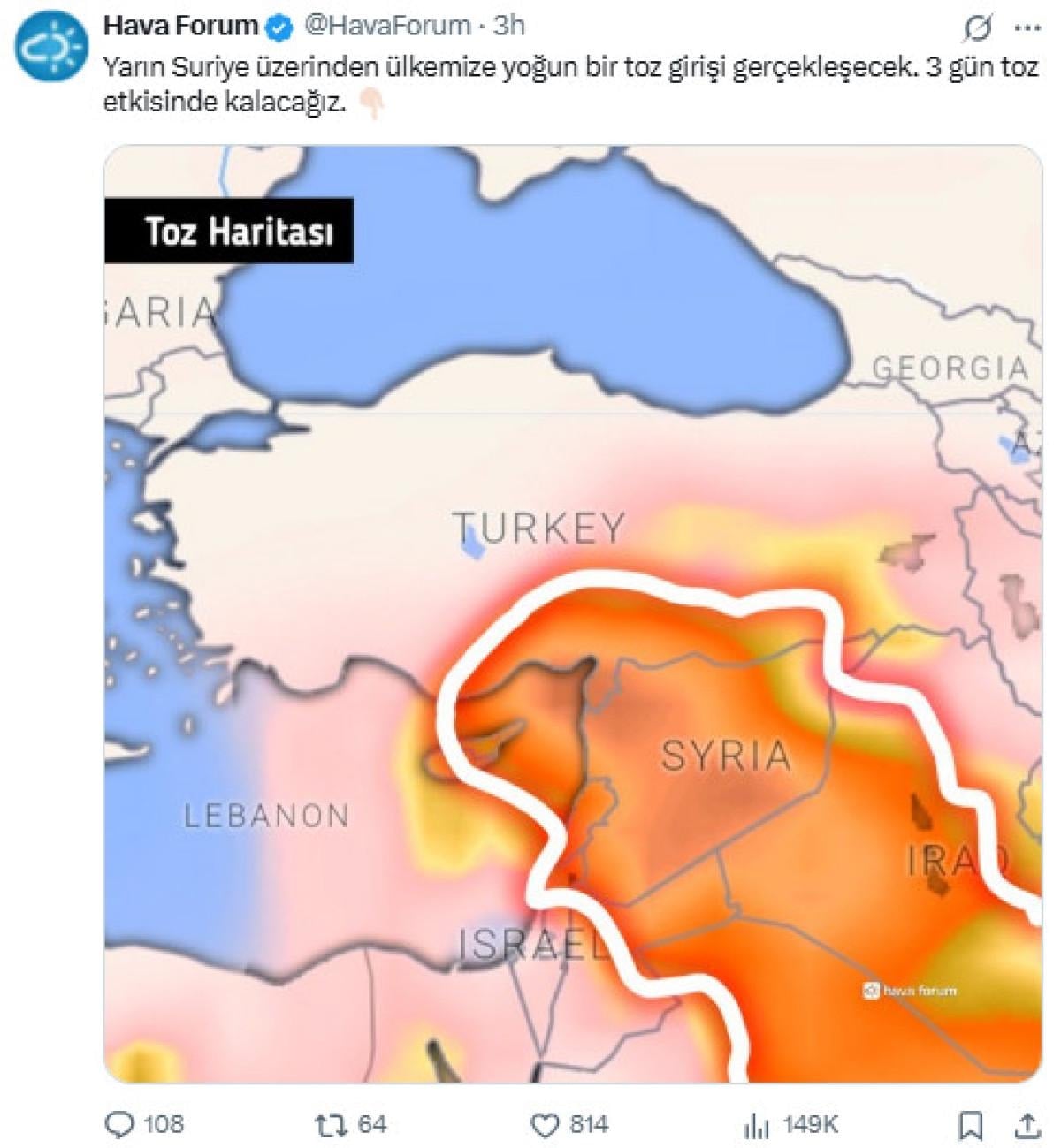 Tarih veren Hava Forum paylaşımında, "Yarın Suriye üzerinden ülkemize yoğun bir toz girişi gerçekleşecek. 3 gün toz etkisinde kalacağız." ifadelerine yer verdi.