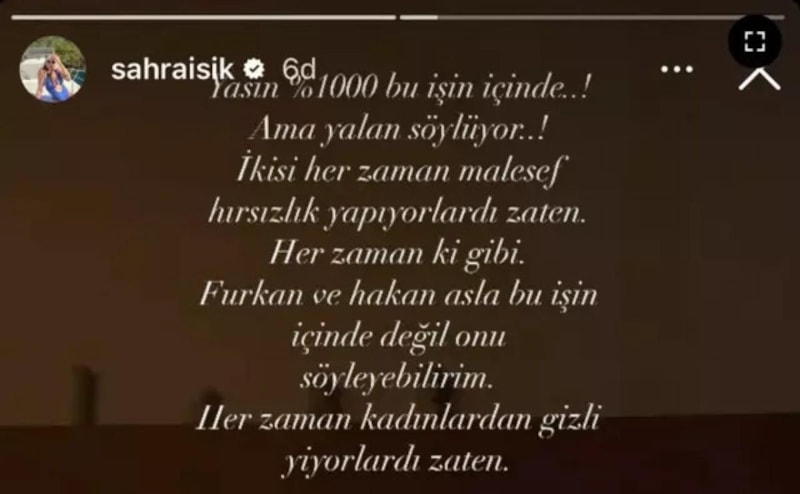 Sahra, sosyal medya hesabından yaptığı paylaşımda önemli bir iddia ortaya attı. Önce yayınlayarak sonra sildiği paylaşımda Sahra, Yasin’in de olayın içinde olduğunu ve ikisinin her hırsızlık yaptıklarını ve kadın yarışmacılardan gizli yediklerini iddia etti.