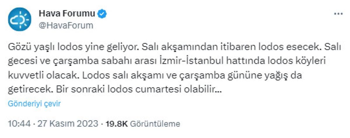 "Gözü yaşlı lodos yine geliyor. Salı akşamından itibaren lodos esecek. Salı gecesi ve Çarşamba sabahı arası İzmir-İstanbul hattında lodos köyleri kuvvetli olacak. Lodos Salı akşamı ve Çarşamba gününe yağış da getirecek. Bir sonraki lodos Cumartesi olabilir..."