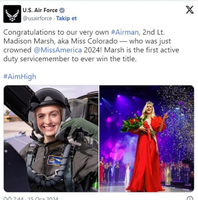 ABD Hava Kuvvetleri’nde görev yapan Teğmen Madison Marsh tarihe geçti. Hem Hava Kuvvetleri’nde pilotluk yapıyor hem de güzellik kraliçesi…