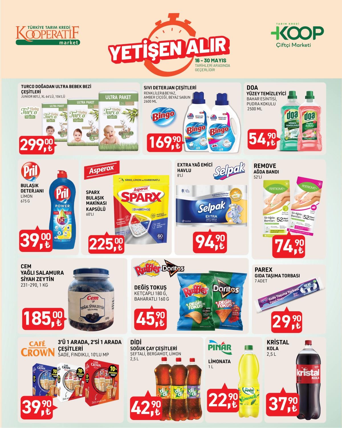 30 Mayıs'a kadar geçerli ürünlerde yüzey temizleyici, sıvı deterjan, bulaşık tableti, havlu kağıt gibi ürünler yer aldı.