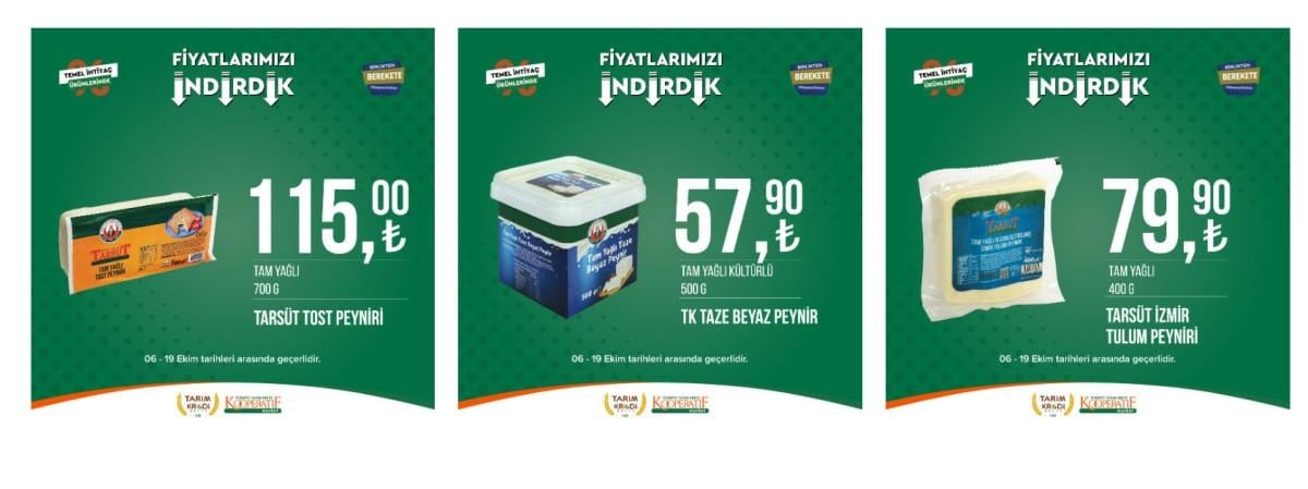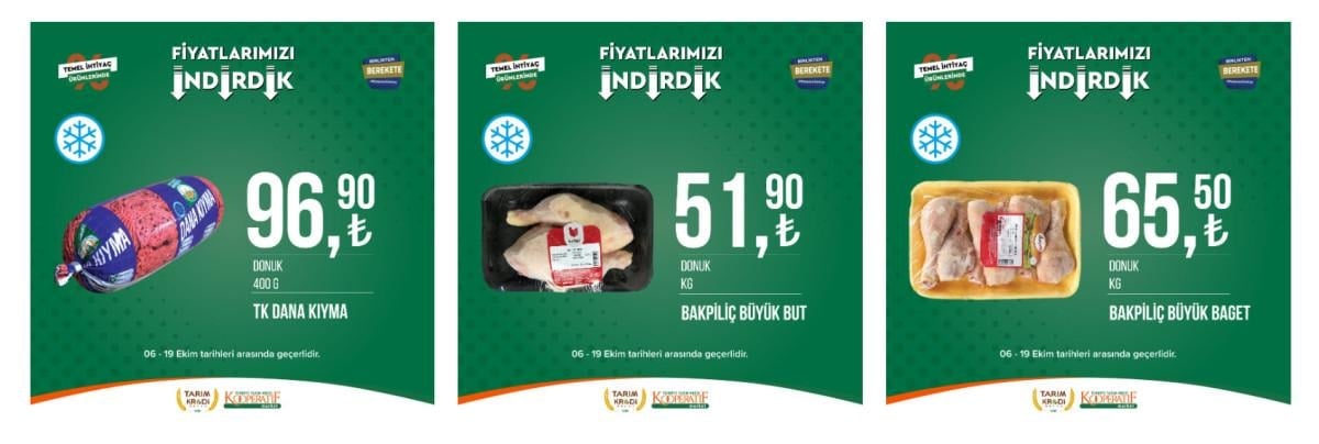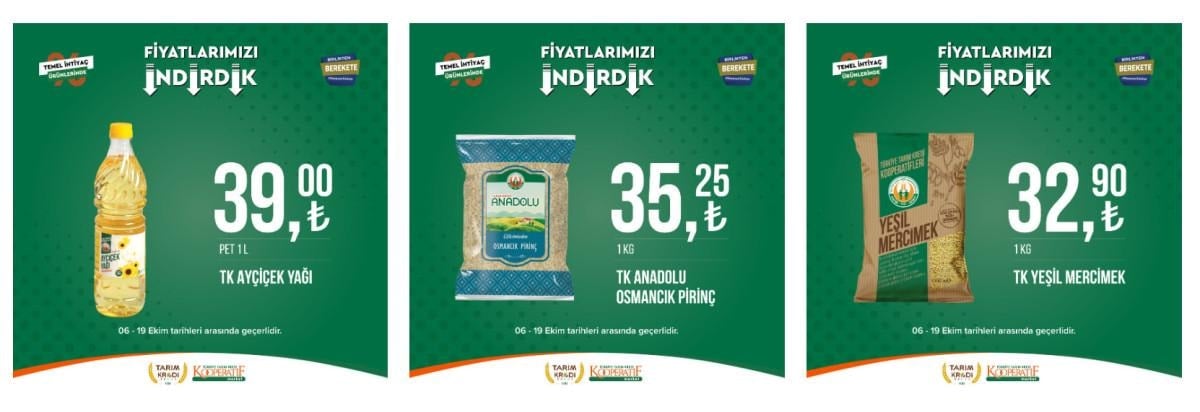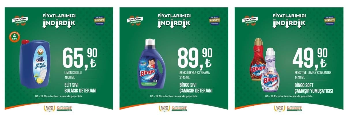 Sabah 09.00- Akşam 22.00 arasında hizmet veren Tarım Kredi Kooperatif marketlerinde et, tavuk, peynir, bakliyat, deterjan gibi birçok üründe fiyatlar düştü.