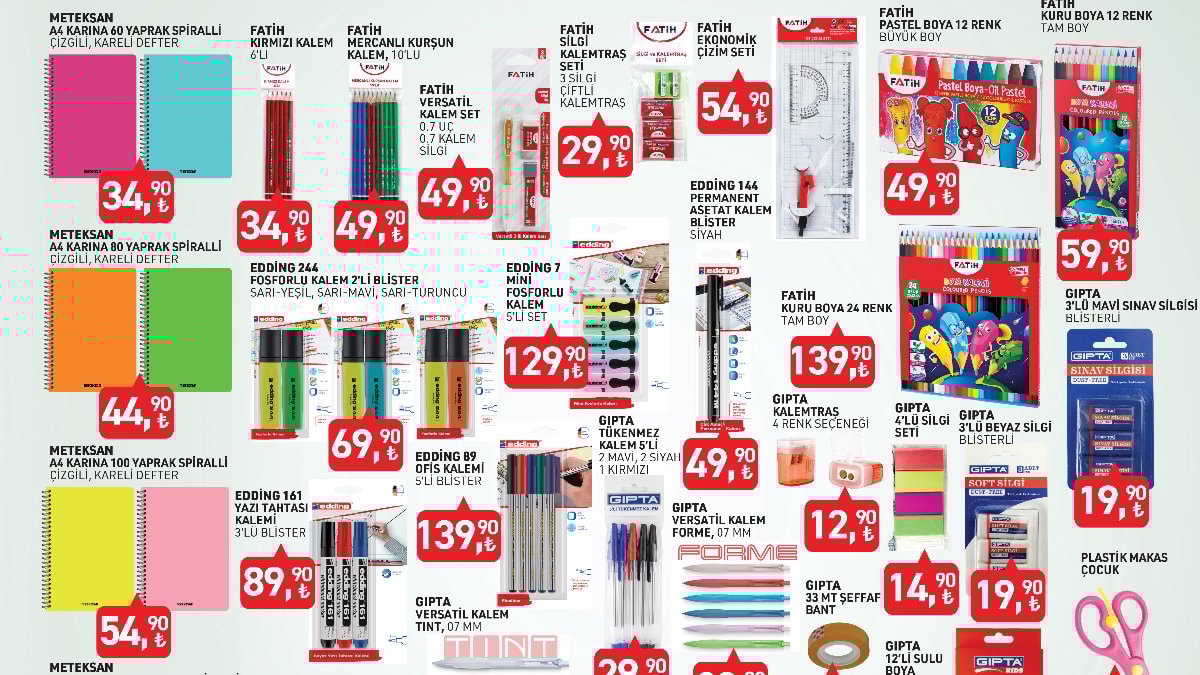 Öğrenciler için tasarlanan ürünler arasında renkli defterler, kalemler, silgiler, dosyalar, boya setleri ve çantalar öne çıkıyor.