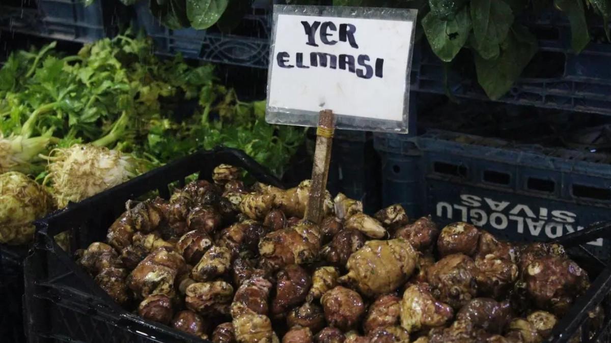 İlkbahar aylarında patates gibi toprağa ekilen yer elmasının hasadına başlanırken, pazarlarda kilosu 50 TL'den satışa sunuluyor.
