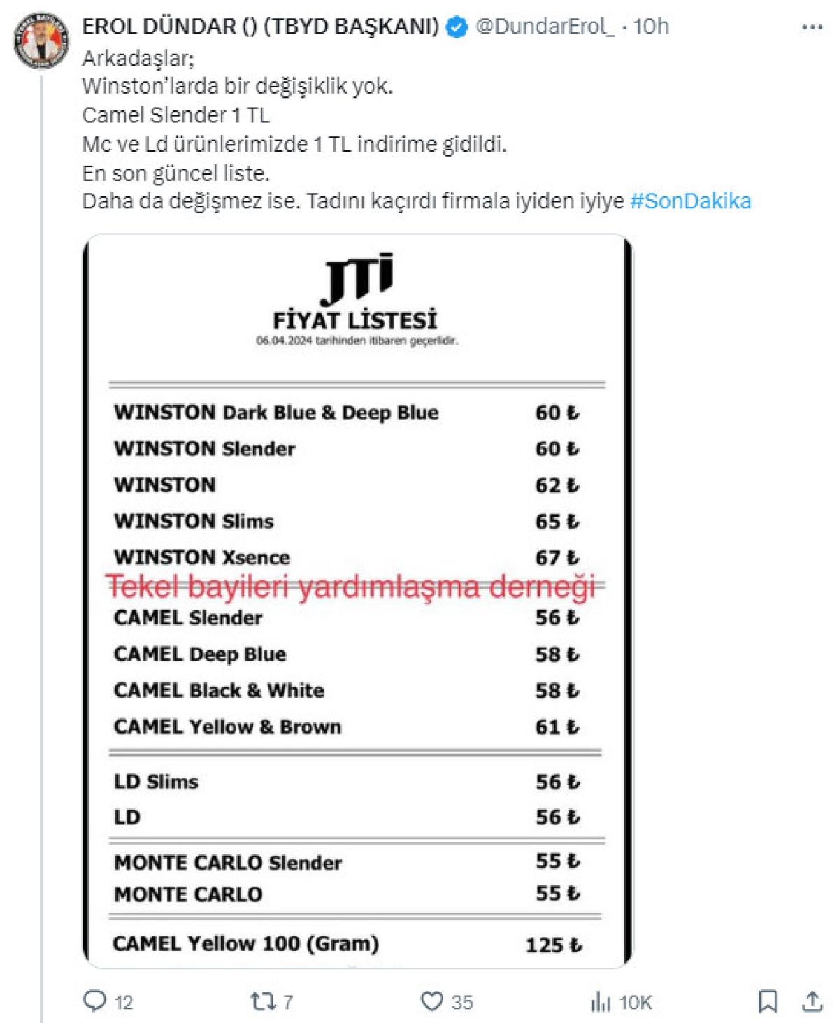 Tekel Bayileri Yardımlaşma Derneği (TBYD) Başkanı Erol Dündar, sosyal medya hesabından yeni haberi duyurdu: Bu kez zam değil, indirim geldi.