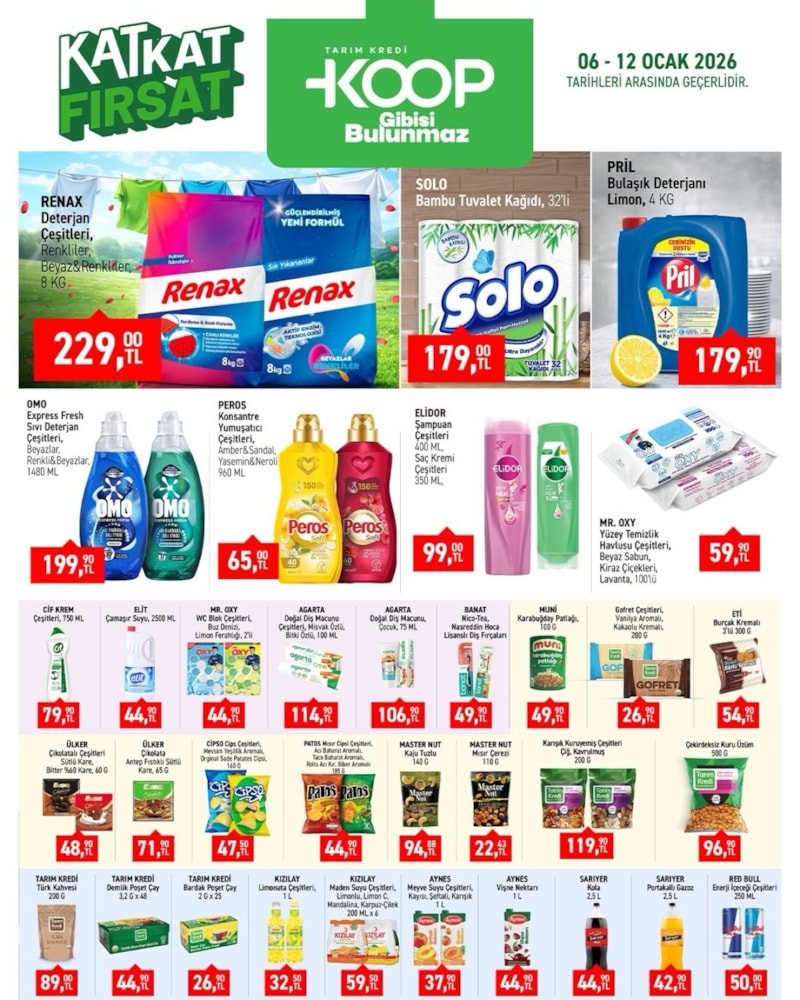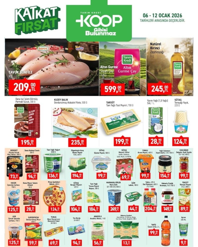KOOP Market 6-12 Ocak arasında geçerli olacak fırsatlar arasında temel gıda, şarküteri, süt ürünleri ve hijyen malzemeleri yer aldı. İşte, yeni afişler...