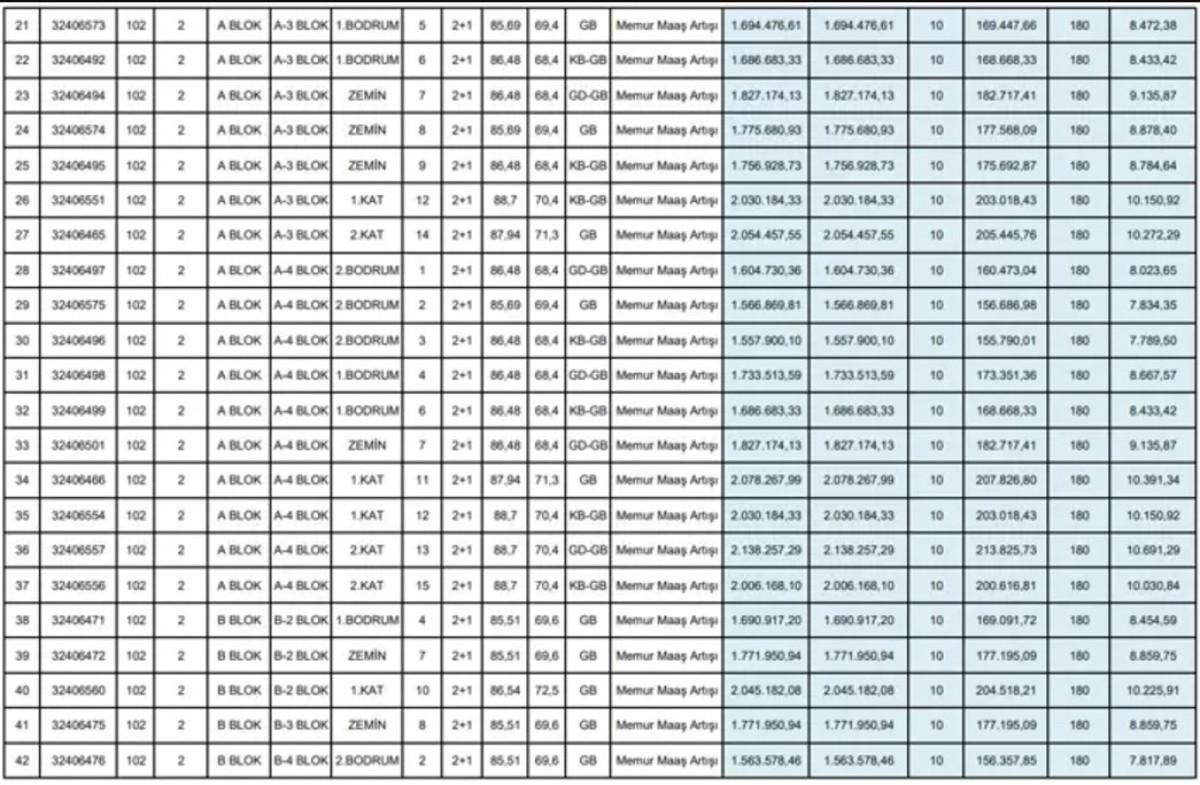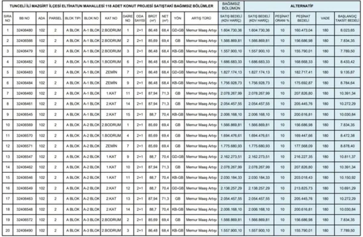 Tunceli’de hayata geçirilen TOKİ konut projesinde, 2+1 ve 3+1 dairelerin fiyat listesi belli oldu.