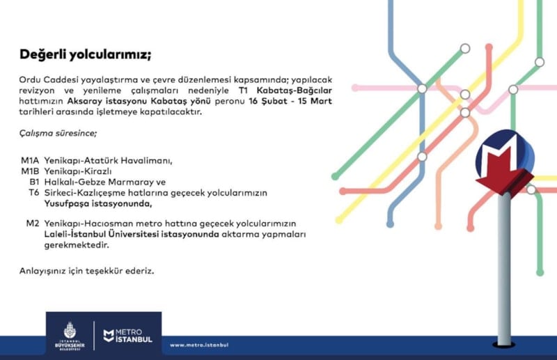 Metro İstanbul’un duyurusuna göre, Aksaray durağından Kabataş yönüne giden tramvay peronu 16 Şubat - 15 Mart tarihleri arasında hizmet veremeyecek.