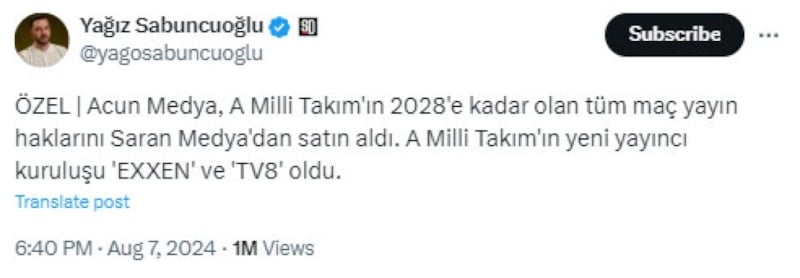 Yağız Sabuncuoğlu’nun haberine göre; A Milli Takım’ın 2028’e kadar olan tüm maçları EXXEN ve TV8 kanallarında yayınlanacak.