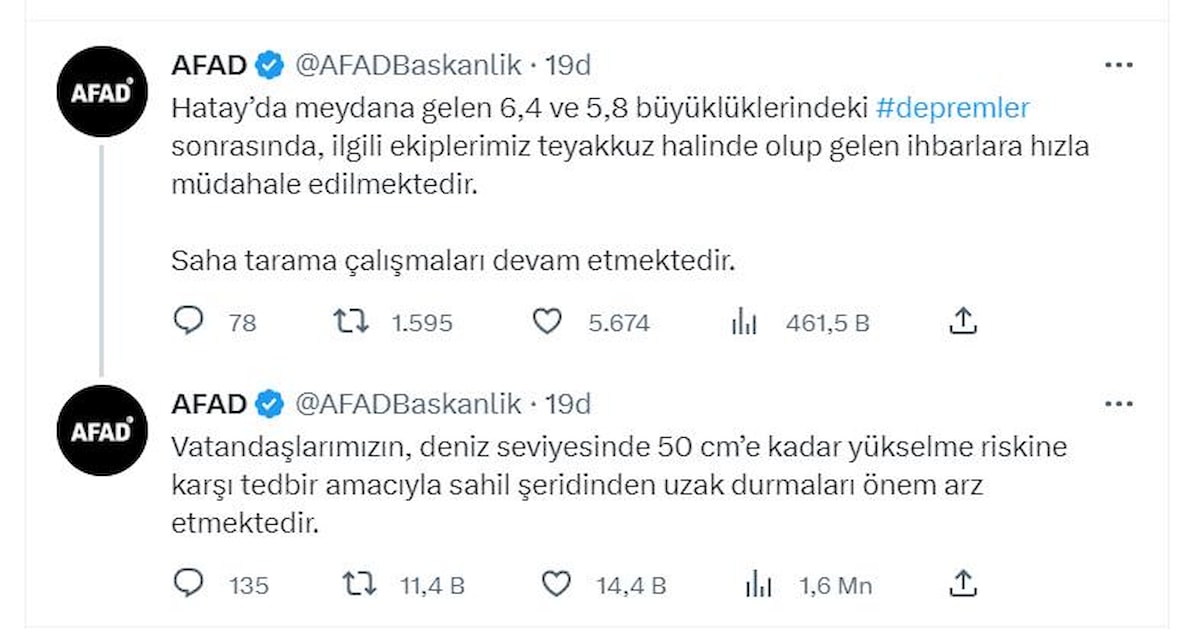 AFAD, sosyal medya hesabından '' Vatandaşlarımızın, deniz seviyesinde 50 cm’e kadar yükselme riskine karşı tedbir amacıyla sahil şeridinden uzak durmaları önem arz etmektedir. '' uyarısında bulundu.