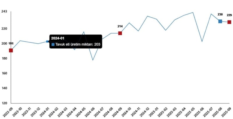 Buna göre, eylülde 228 bin 846 ton tavuk eti üretimi yapıldı. Üretim, yıllık bazda yüzde 6,9 arttı, aylık bazda yüzde 0,5 azaldı.