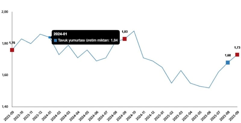 Tavuk yumurtası üretimi, eylülde aylık bazda yüzde 3,1 yükseldi, geçen yılın aynı ayına göre yüzde 5,3 düştü. Bu dönemde 1 milyar 731 milyon 478 bin tavuk yumurtası üretildi.