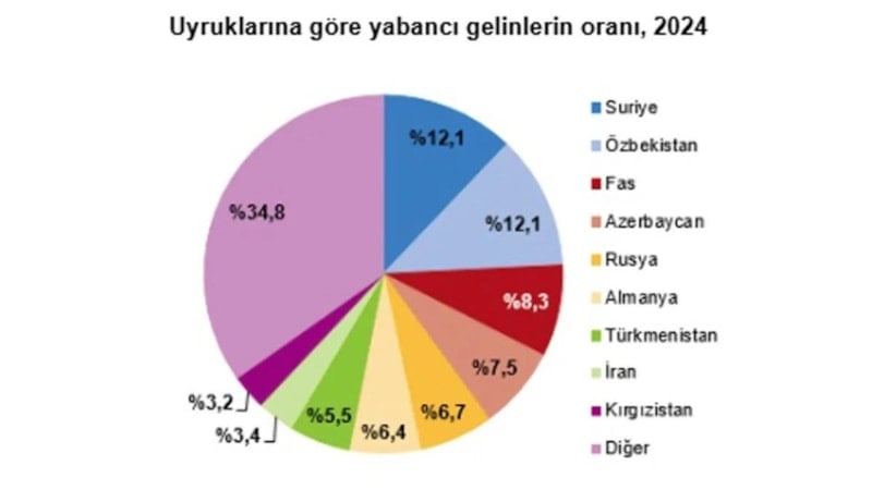 Türkiye’de en çok yabancı gelin Suriye ve Özbekistan uyruklu oldu. Listeyi sırasıyla Fas, Azerbaycan, Rusya, Almanya, Türkmenistan, İran, Kırgızistan takip etti.