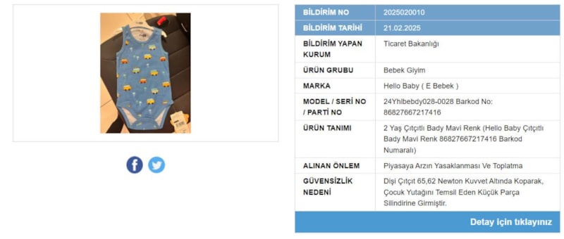 Son yapılan denetimlerde, eBebek mağazalarında satılan Hello Baby markasına ait bir zıbının boğulma riski taşıdığı tespit edildi.