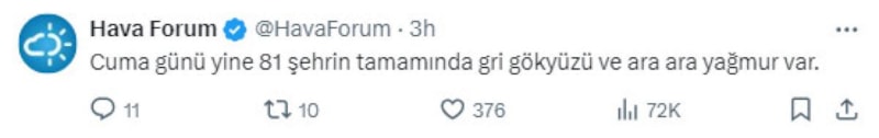 "Cuma günü yine 81 şehrin tamamında gri gökyüzü ve ara ara yağmur var."