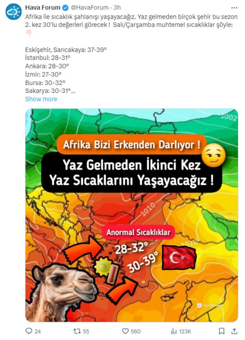 Meteoroloji kaynağı Hava Forum, X hesabından yaptığı paylaşımla Afrika sıcak hava dalgasının gelişini duyurdu.