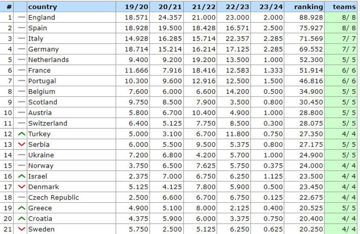 İşte bu hafta oynanan Avrupa kupası maçlarının ardından oluşan güncel ülke puanı sıralaması;