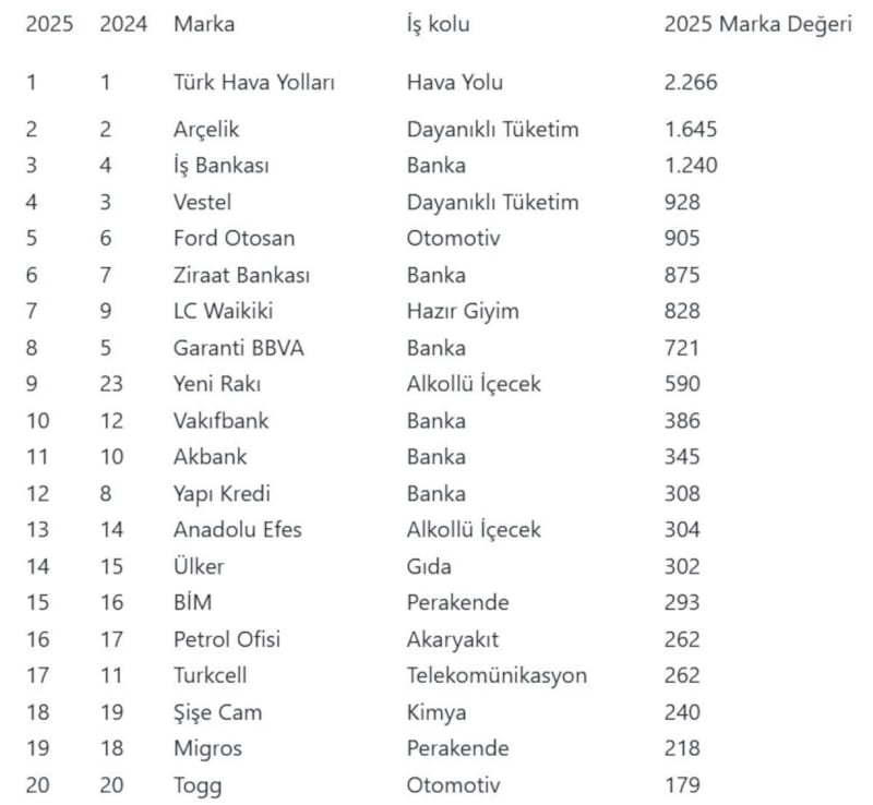 Uluslararası marka değerlendirme kuruluşu Brand Finance, 2025 yılına ilişin yaptığı "Türkiye'nin En Değerli Markaları-Türkiye 125" çalışmaları tamamlandı.