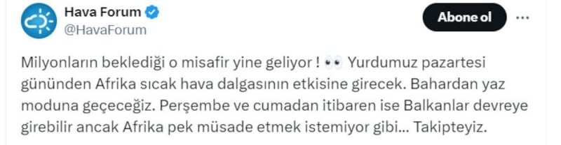 Paylaşımda, "Milyonların beklediği o misafir yine geliyor! Yurdumuz pazartesi gününden Afrika sıcak hava dalgasının etkisine girecek. Bahardan yaz moduna geçeceğiz. Perşembe ve cumadan itibaren ise Balkanlar devreye girebilir ancak Afrika pek müsade etmek istemiyor gibi... Takipteyiz." ifadeleri kullanıldı.