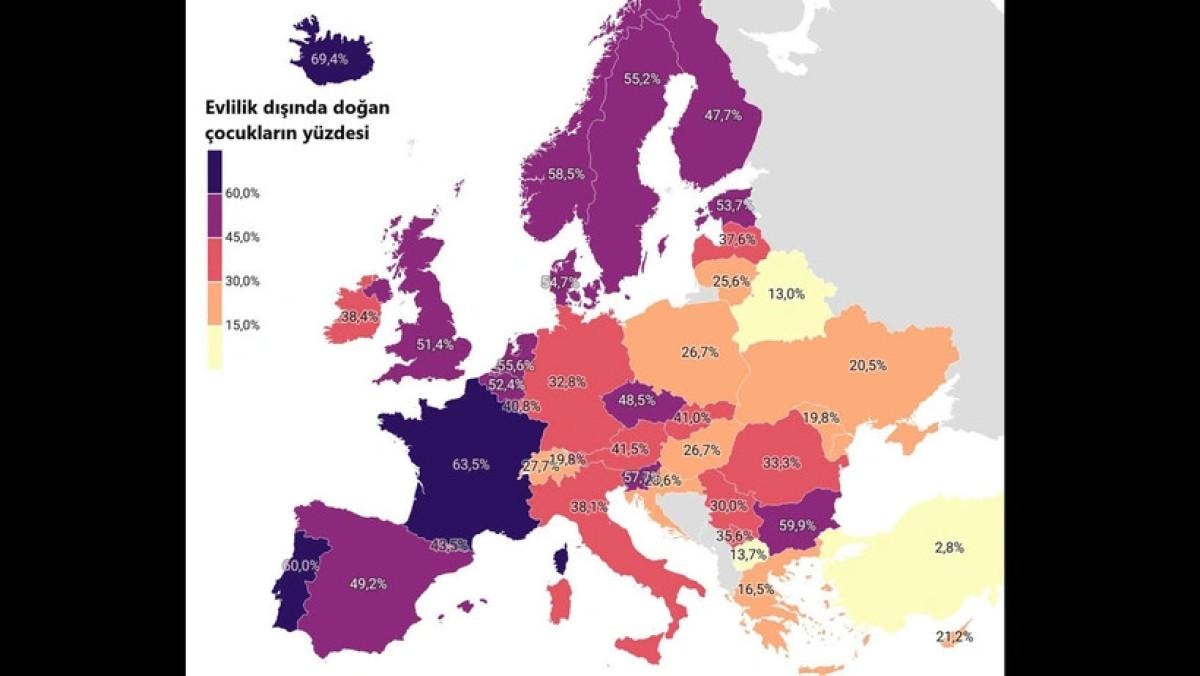 Fransa, İskandinav ülkeleri ve İngiltere gibi ülkelerde evlilik dışı doğum oranlarının oldukça yüksek olduğu gözlemlenirken, Türkiye bu sıralamada oldukça geride kaldı.