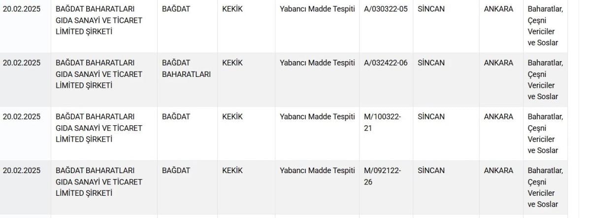 Bakanlık tarafından yayınlanan yeni listede ünlü baharat markaları arasında yer alan Bağdat Baharatları Gıda Sanayi ve Ticaret Limited Şirketi, yedi farklı kekik ürününde “yabancı madde tespiti” nedeniyle listeye eklendi.