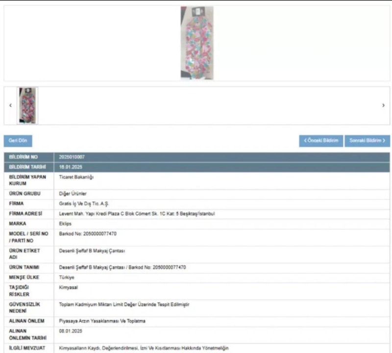 Gratis mağazalarında satışı yapılan Eklips markalı makyaj çantasında tespit edilen sağlığa zararlı kimyasallar nedeniyle toplatılmasına karar verildi.