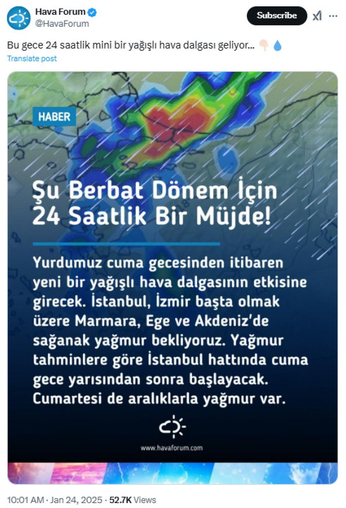 Meteoroloji kaynağı Hava Forum, X hesabı üzerinden yaptığı paylaşımla bu gece yağış müjdesini verdi.