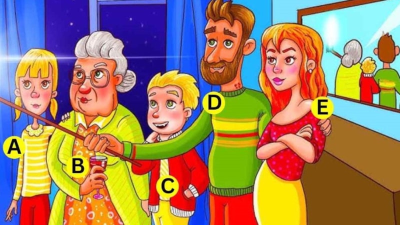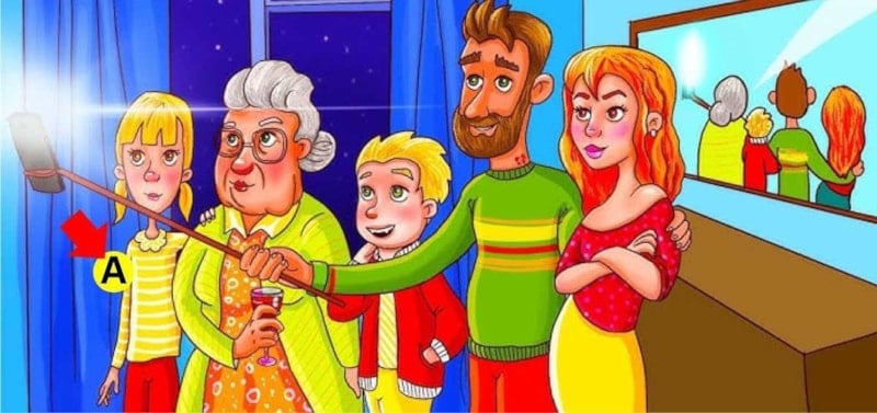 Bu görüntü, beş kişilik bir grubu (bir çift, iki çocuk ve yaşlı bir kadın) selfie için poz verirken gösteriyor. Ancak, uğursuz bir durum var: Bunlardan biri vampir!