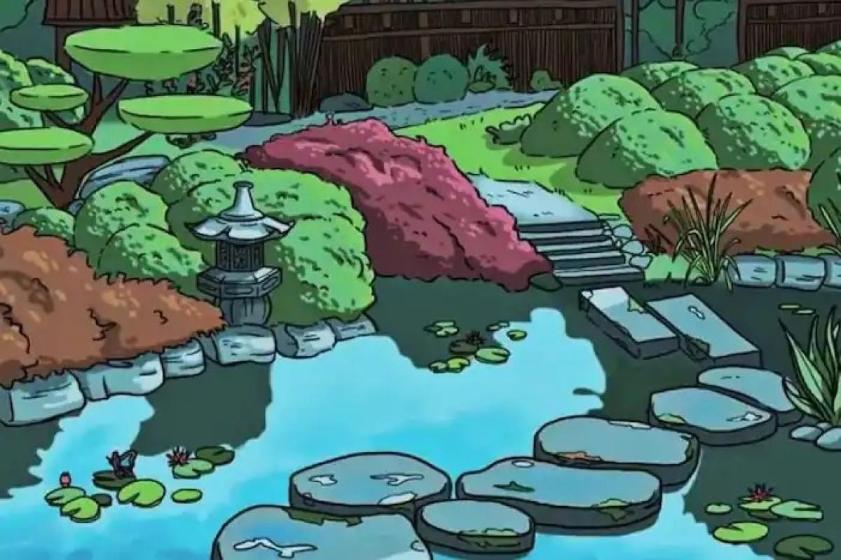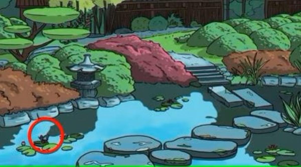 Bulmaca resminde çalılar, çimenler ve kayalarla çevrili bir yer gösterilir. Bu resimde bir yerde, bir kelebek göletin üzerinde saklanmaktadır ancak onu görmek kolay değildir.