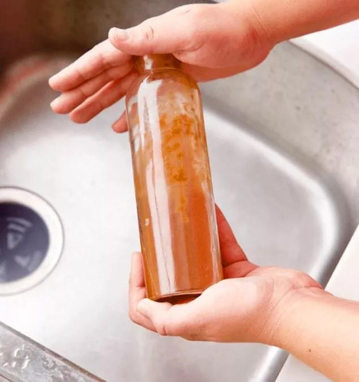 Yağ kalıntıları yumuşayınca şişenin içini biraz boşaltın ve çalkalamaya başlayın.