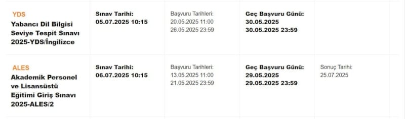 2025 sınav takviminde YDS sonuç tarihi bilgisi yer almıyor.