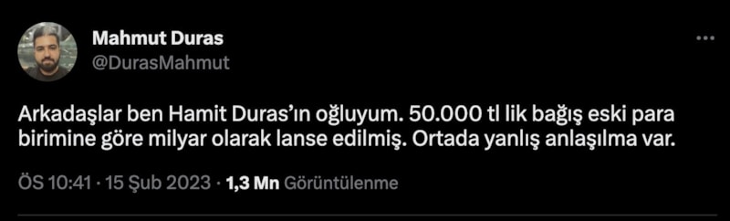 "Yanlış anlaşılma sonucu oluşan durumu düzeltme gereği duymaktayız. Yeni Çamoluk Otomotiv olarak yaptığımız bağış miktarı 50 bin liradır."