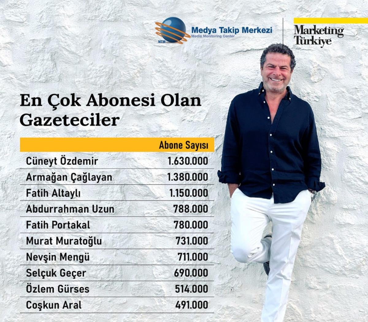Hazırlanan rapora göre birçok ünlü gazetecinin yer aldığı listede abone sayısında milyonu bulan üç isim ise, 1 milyon 600 bin ile Cüneyt Özdemir, 1 milyon 380 bin ile Armağan Çağlayan ve kısa bir sürede 1 milyon takipçiye Fatih Altaylı şekilde belirlendi.