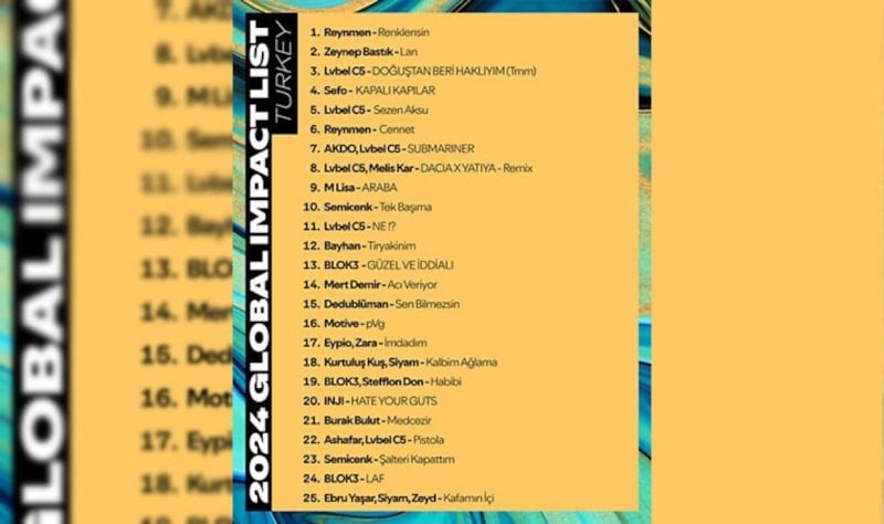 Yurtdışında en çok dinlenen Türk sanatçılar arasında Reynmen “Renklensin” adlı şarkısıyla ilk sırada yer alırken, Zeynep Bastık’ın “Lan” adlı şarkısı ve Lvbel C5’in “Doğuştan Beri Haklıyım (tmm)” şarkısı ikinci sırada yer aldı.