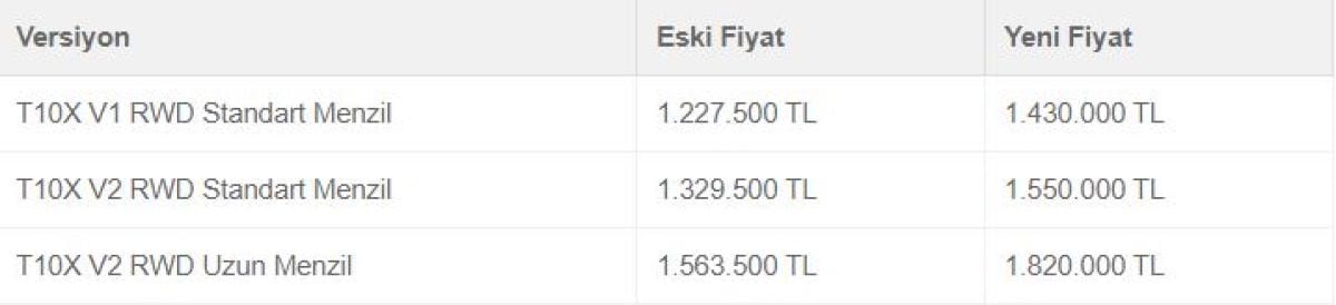 Özel Tüketim Vergisi (ÖTV) matrah güncellemesi kapsamında, %10'luk dilimdeki üst sınırın 1.650.000 TL'den 1.914.000 TL'ye yükseltilmişti. Bu güncelleme yapılmamış olsaydı, T10X'in Uzun Menzilli versiyonu, gerçekleşen bu zam ile birlikte %40 ÖTV dilimine geçecekti.