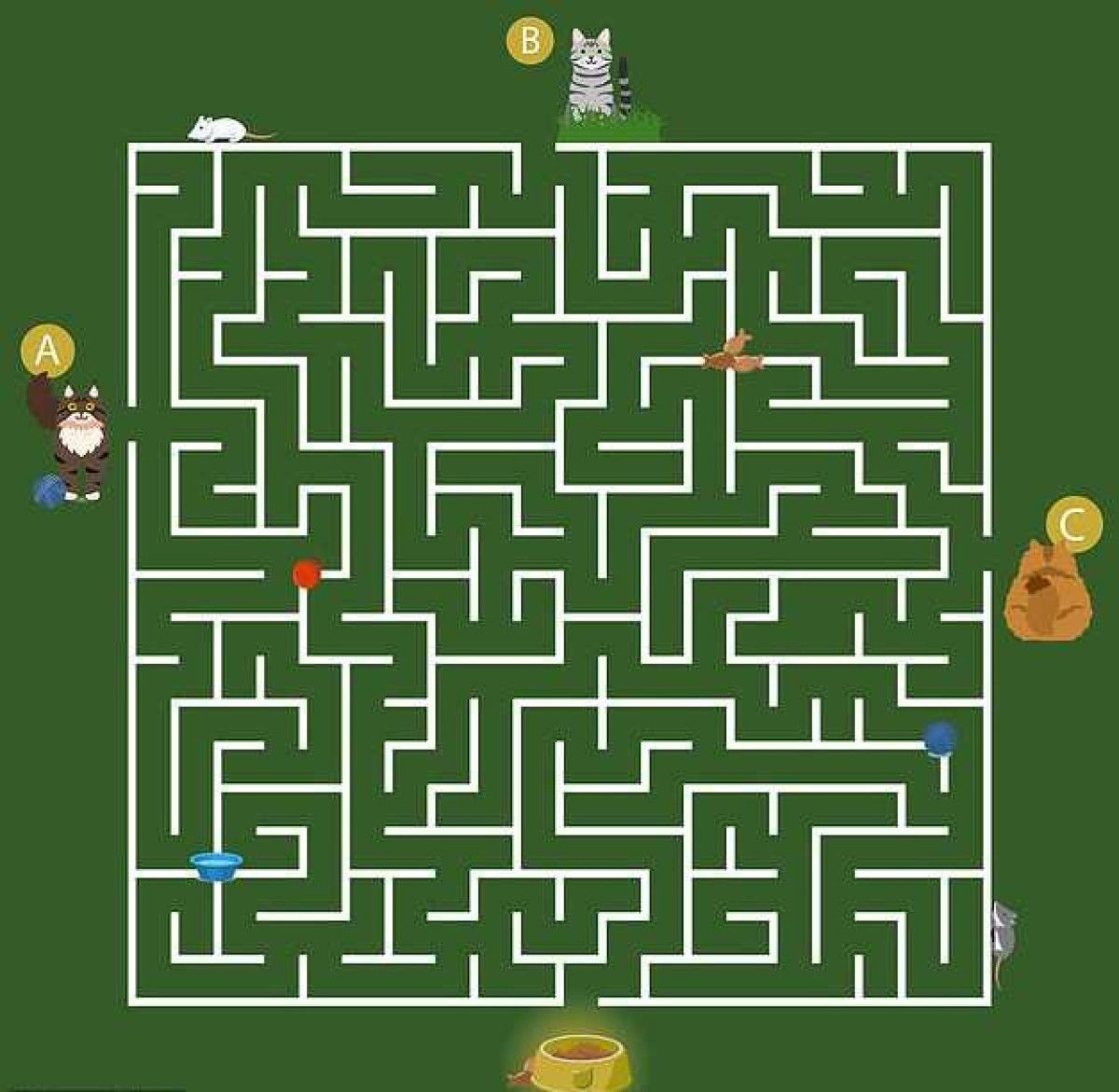 Yukarıda paylaşılan resimde, üç ucunda A, B ve C olarak etiketlenen üç kedinin oturduğu bir labirent görülüyor. Dördüncü uçta ise mama kabı var.
