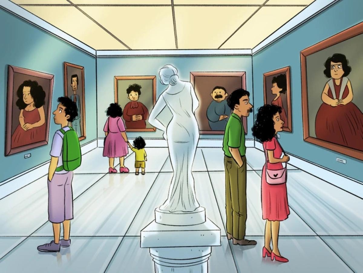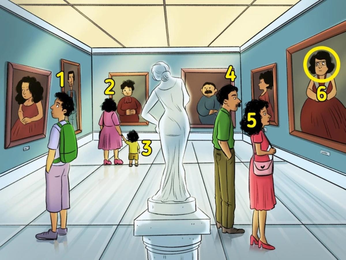 Yukarıdaki resimde bir sergi gezisi yer alıyor. Fotoğrafları inceleyen kişilerin dışında gizlenen kişiler de olabilir.