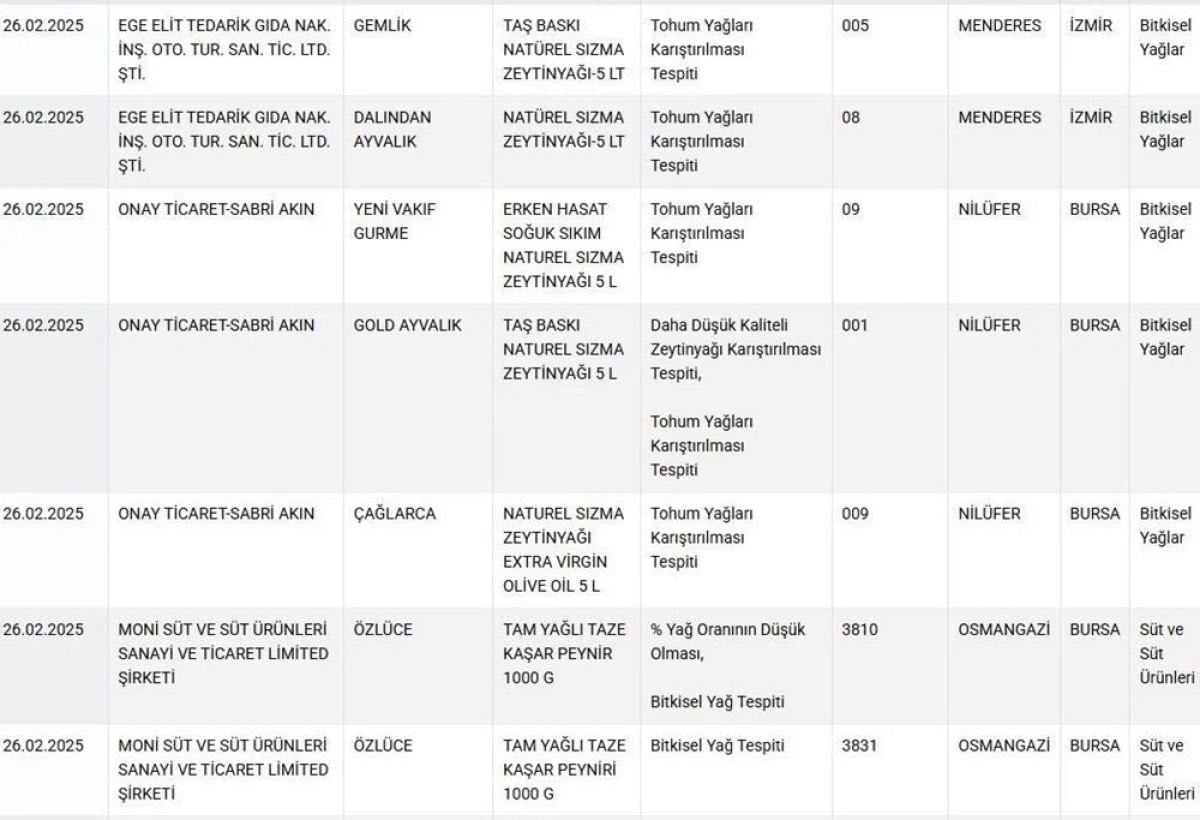 Son olarak yapılan denetimlerin ardından 26 Şubat 2025 tarihi itibariyle güncellenen listeye yeni eklenen zeytinyağı ve peynir markaları dikkat çekti.