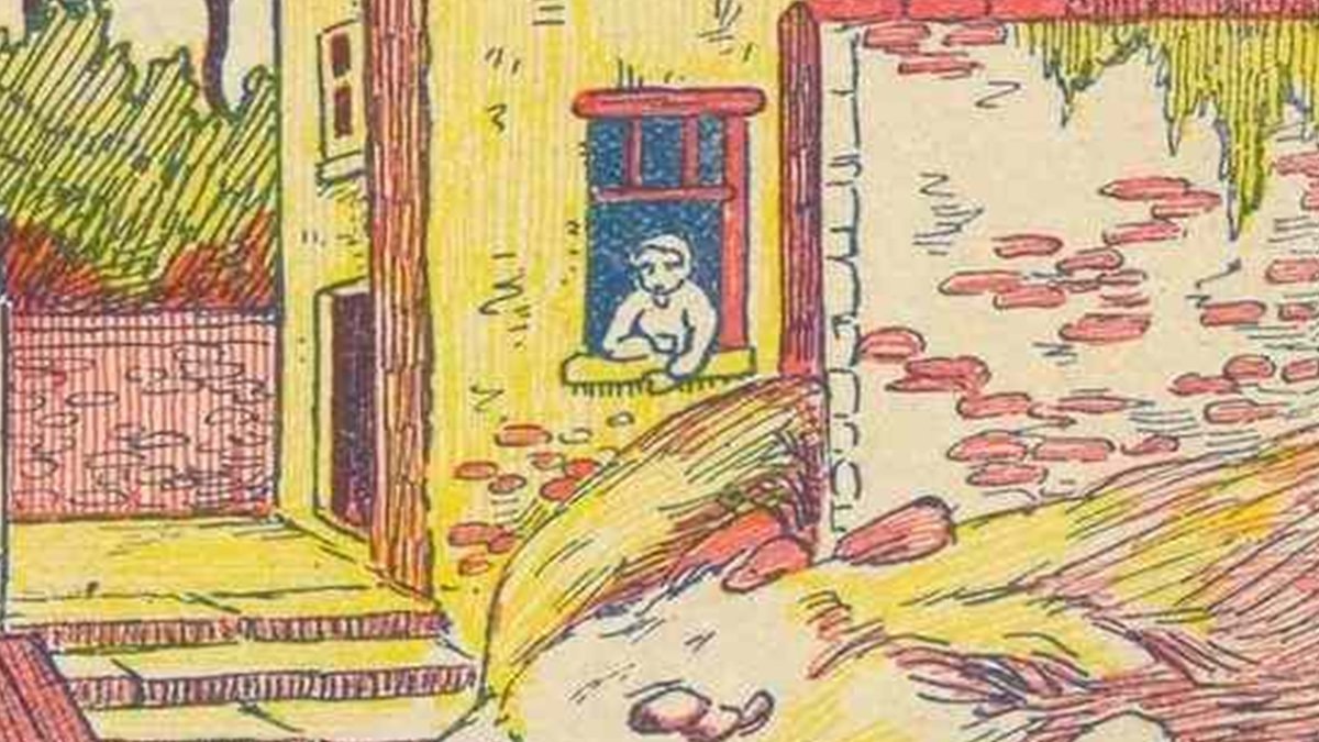 Bir resimde, büyük bir evin avlusunda yaşanan ilginç bir olay var.