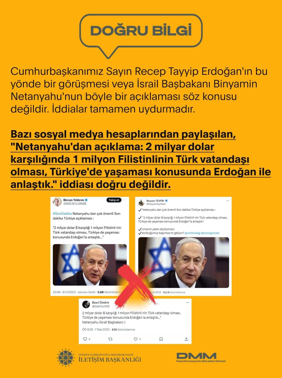 Cumhurbaşkanlığı İletişim Başkanlığı Dezenformasyonla Mücadele Merkezi’nden yapılan açıklamada, bazı sosyal medya hesaplarındaki "Netanyahu'dan açıklama: 2 milyar dolar karşılığında 1 milyon Filistinlinin Türk vatandaşı olması, Türkiye'de yaşaması konusunda Erdoğan ile anlaştık." iddiasının doğru olmadığı bildirildi.