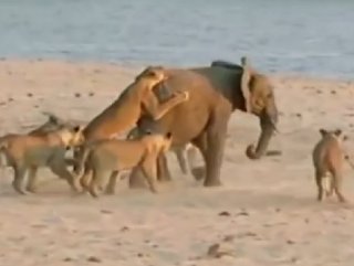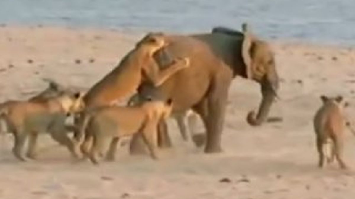 Genç filin kendisine saldıran 14 aslanla amansız bir mücadeleye girişmesi kameralar tarafından kaydedildi. Görüntülerde, yavru fil 14 aslana kafa tutarak kendini savundu. Filin bu çabası karşısında neye uğradıklarını şaşıran aslanlar, fili yenmek için adeta yarışa girdiler. Aslanların mücadelesine karşı yılmayan fil, sonunda suya girerek aslanların elinden kurtulmayı başardı.