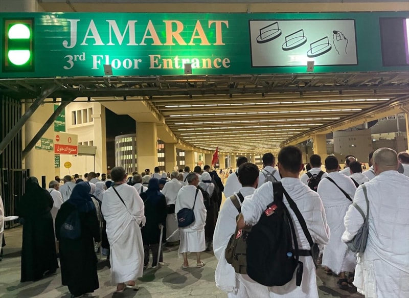Müslümanlar, gece yarısından itibaren kafileler halinde yaklaşık 3,5 kilometrelik yolu yürüyerek geçtikleri Cemerat'taki şeytan taşlama alanında, büyük şeytan olarak ifade edilen "Akabe Cemresi"ne 7 taş attı.