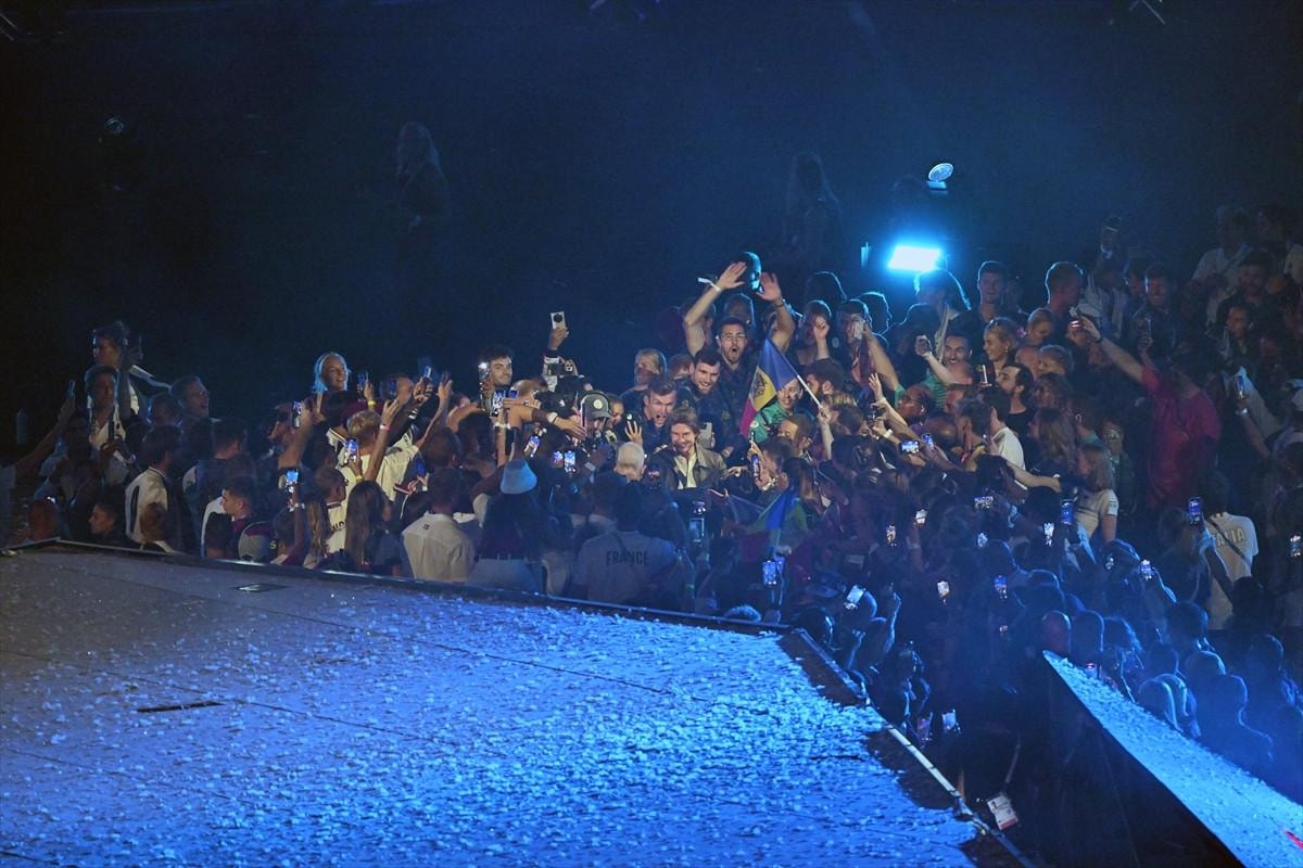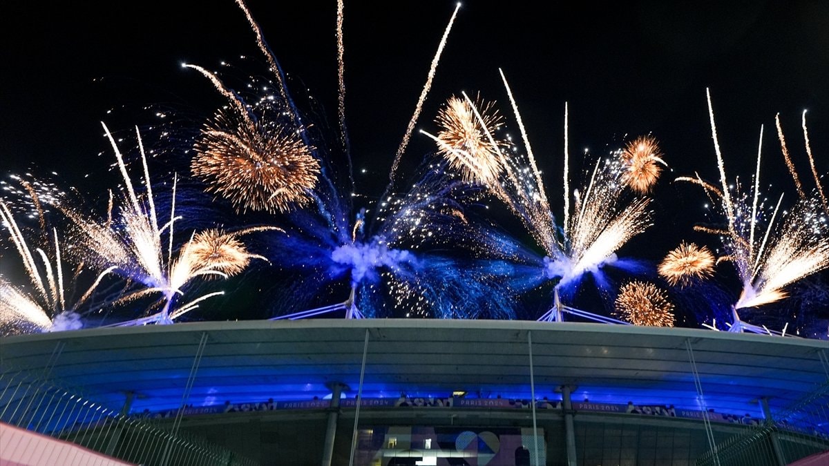 Paris 2024 Olimpiyat Oyunları'nda 4 altın ve bir bronz madalya kazanan Fransız yüzücü Leon Marchand'ın tarihi Tuileries Bahçesi'ndeki olimpiyat ateşini söndürmesiyle başlayan törende daha sonra Fransa marşı okundu.