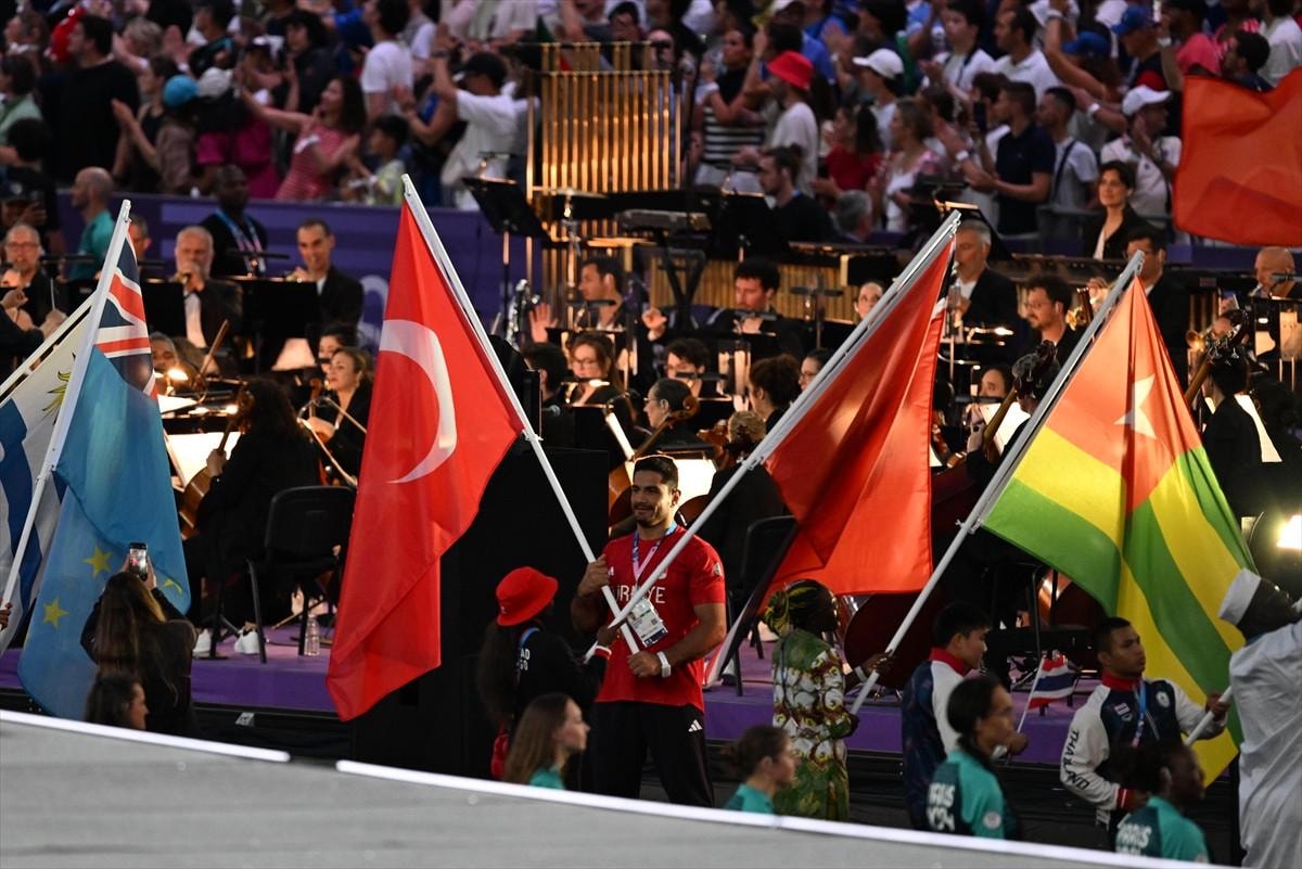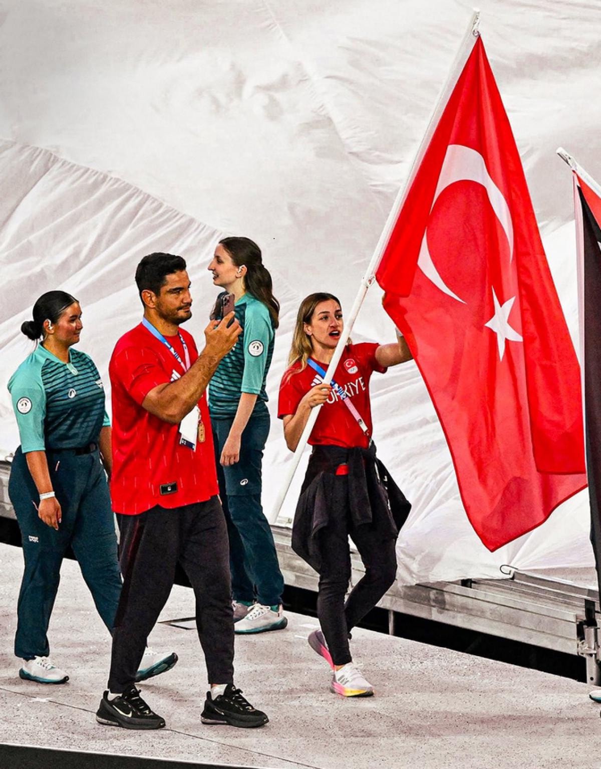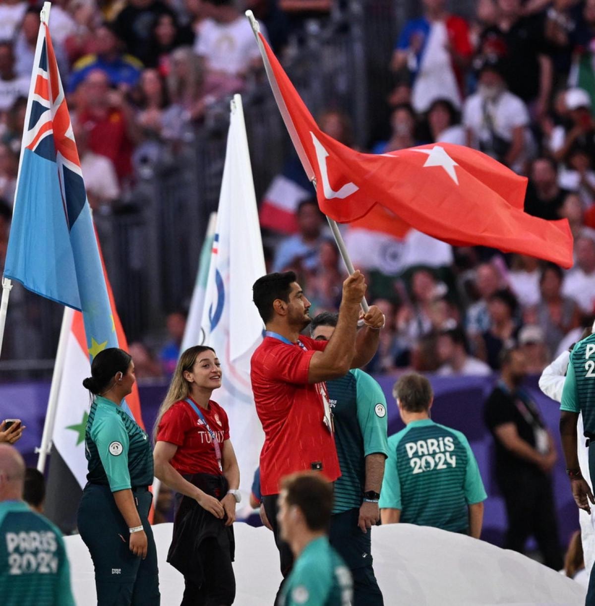 Türkiye'nin bayrağını olimpiyatlarda gümüş madalya kazanan milli boksör Buse Naz Çakıroğlu ile bronz madalya alan milli güreşçi Taha Akgül taşıdı.
