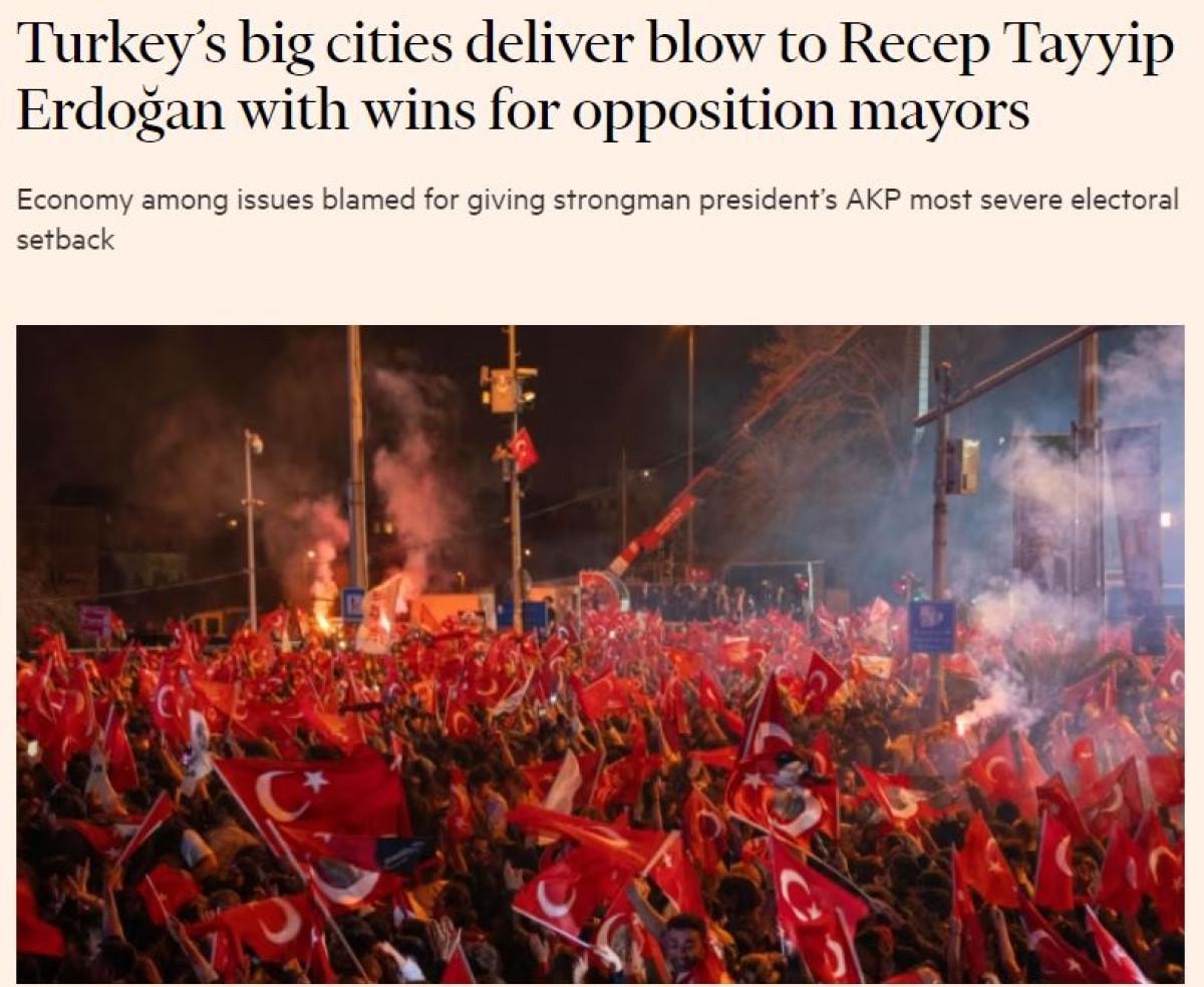 Financial Times, Türkiye'nin beş büyük şehri olan İstanbul, Ankara, İzmir, Bursa ve Antalya'da CHP'nin adaylarının kazandığını belirtti.