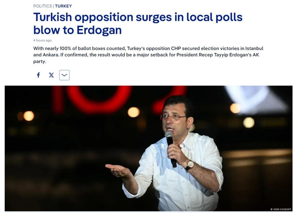 Almanya basınından Deutsche Welle (DW), "Türk muhalefeti yerel seçimlerde yükseldi." ifadesini kullandı.