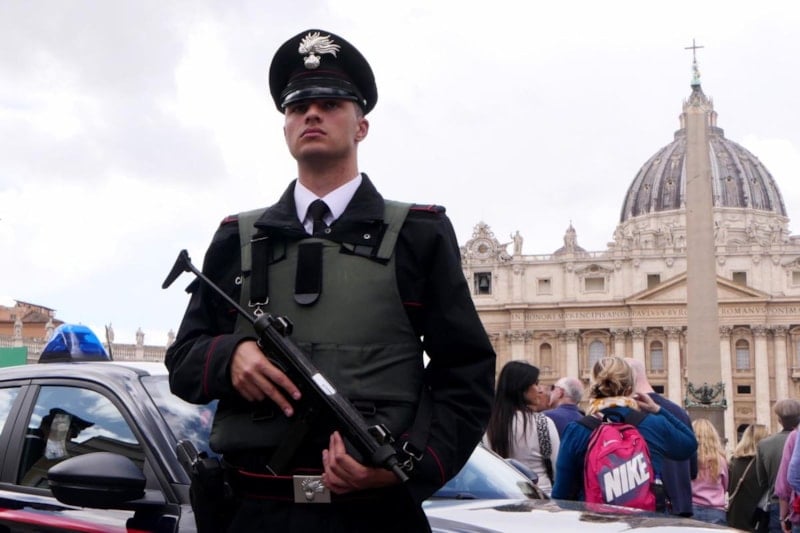 İtalyan ve Vatikan yetkilileri cenaze töreni öncesinde Aziz Petrus Bazilikası'nın çevresini sıkı güvenlik altına aldı; insansız hava araçları engellendi, çatılara keskin nişancılar yerleştirildi ve savaş uçakları hazır bekletildi.