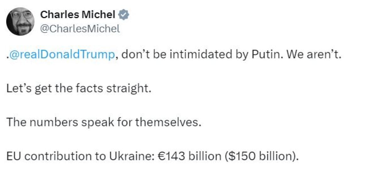 Michel, X hesabından, Trump'ın Ukrayna'ya asıl yardım etmesi gerekenin ABD değil Avrupa olduğu yönündeki sözlerine yanıt verdi.