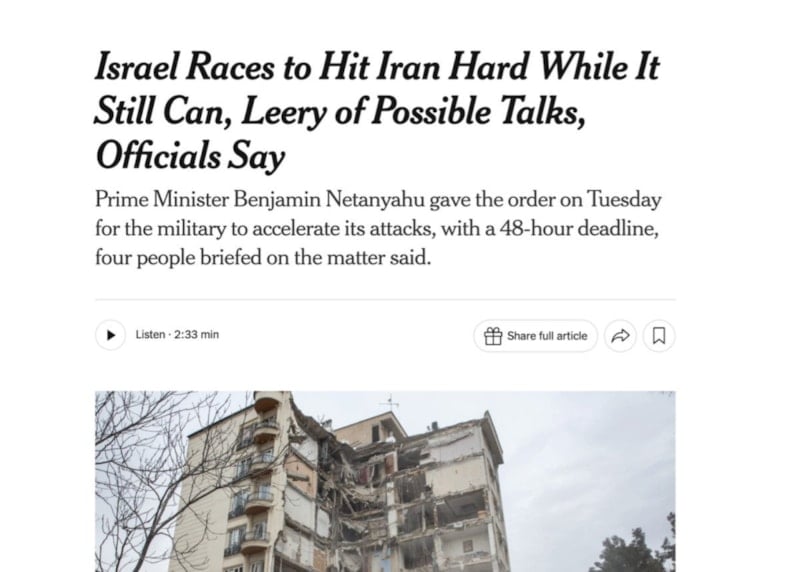Haberde, "ABD ile İran arasında görüşme potansiyelinin artmasıyla birlikte İsrail ordusu, savaşın yakında sona erebileceği endişesiyle olabildiğince çok önemli hedefi vuruyor." ifadeleri yer aldı.