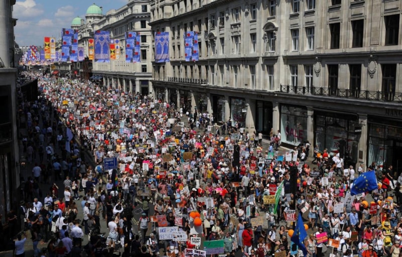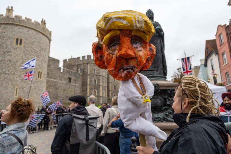 Göstericiler, İngiltere'ye 2 günlük resmi ziyaret düzenleyen Trump'ın, iklim, göç, uluslararası ilişkiler ve Gazze konusundaki tutumunu protesto etti.